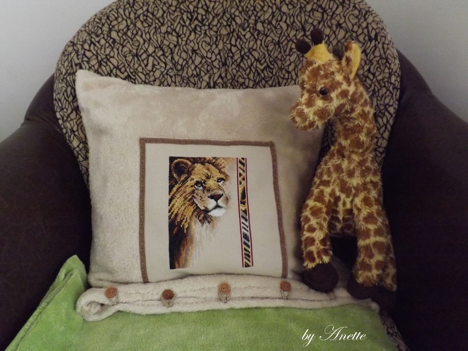 Vegre elkeszult a Janlynn oroszlan mintas parna, amit a kisfiamnak keszitettem. Pluss anyagot vettem a huzatnak, tenyleg nehez vele dolgozni. ( Bea is irta az egyik bejegyzeseben) De eleg jol haladt az osszeallitasa, bar az igaz, hogy KEZZEL varrtam az egeszet. Ciki, nem ciki, de nincs varrogepem es nem is tudok vele varrni, maximum talan nadragszar felvarrast. Talan.... Na mindegy, nem latszik rajta, hogy kezzel keszult, eleg jo lett. Legalabb elmondhatom rola, hogy teljes egeszeben kezmuves darab :-) :-) Meg a gomblyuknak a bujtatokat is ugy horgoltam ra.